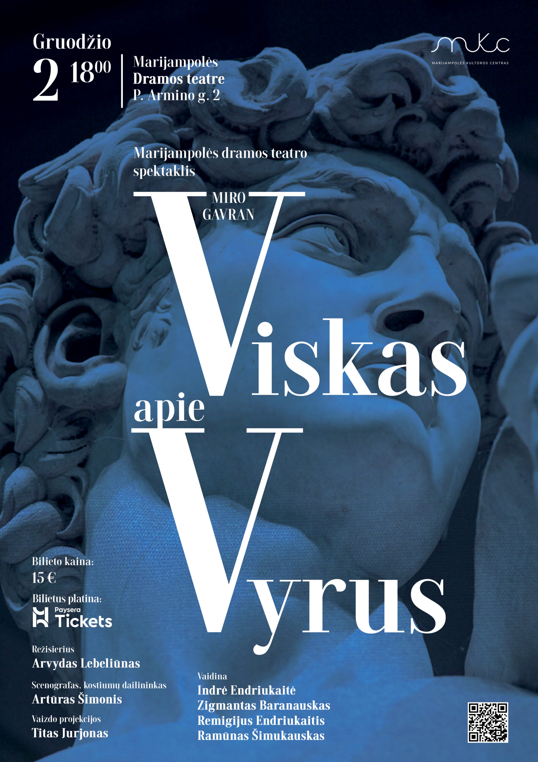 MIRO GAVRAN „VISKAS APIE VYRUS“ „Viskas apie vyrus“ – komiška drama (tragikomedija), kurioje nagrinėjamos vyriškosios tapatybės, santykių, emocijų, vienatvės ir draugystės temos. Spektaklis – tarsi mozaika, kuri humoro forma atskleidžia vyrišką psichologiją ir vyrų bandymus atitikti visuomenės lūkesčius, būti „kietais“, stipriais, racionaliais. Spektaklyje atsiskleidžia ir vyriškos vienatvės tema, kai po humoro paviršiumi galime justi slypintį gilų […] ...